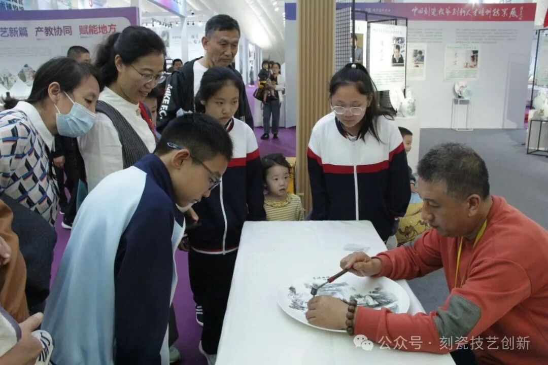 《中国刻瓷技艺创新人才培训》结业展在A馆展区,共展出来自全国14个省、市、自治区的30名学员共计90件作品,全面呈现了学员们在培训期间所取得的创新成果,彰显出刻瓷技艺在当代语境中所蕴含的传承力量与艺术活力。在展览中,山东省工艺美术大师侯刚现场进行刻瓷技艺演示,精湛的技艺引来了大批观众驻足欣赏,成为展场中一道亮眼的风景。