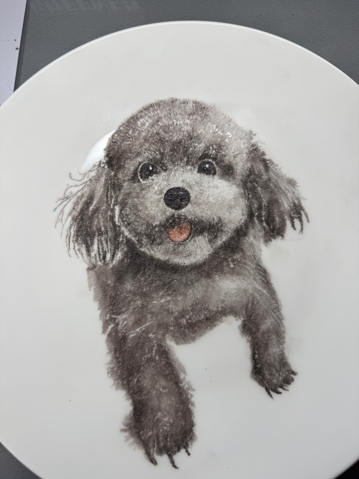 在国家艺术基金刻瓷技艺人才培训项目中,作者在日常基础技艺练习动物作品中,尝试以刀刻出动物的丝毛感,相比传统绘画更具有立体,丝质的毛发触觉。作品《狗》(图1)在圆形陶器上,利用刻刀在盘面上留下长短不一的痕迹,通过刻刀的深浅、角度调整头部、耳朵、身体、眼睛等不同区域的块面,处理出虚实相宜的画面感,凸显出头部中眼神的灵动感,毛发的丝绒感,淄博刻瓷的工艺特点可以非常巧妙的在坚硬的瓷器中还原动物的柔软度,让整体产生“刚柔并济”的效果。